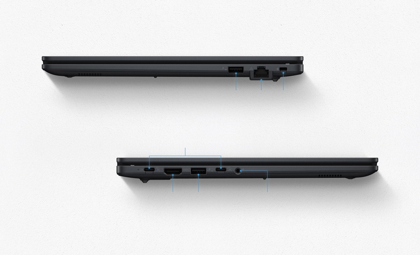 ASUS ExpertBook B1 is equipped with a variety of I/O ports to support all your connectivity needs. It includes two USB 3.2 Gen 2 Type-C ports that offer full functionality with support for Power Delivery and DisplayPort. Additionally, there are two USB 3.2 Gen 1 Type-A ports for your standard USB devices. For video output, the laptop features an HDMI 1.4b port. Audio needs are met with a 3.5mm combo audio jack. Moreover, security is enhanced with a Kensington nano lock slot, and network connectivity is provided by an RJ45 port.